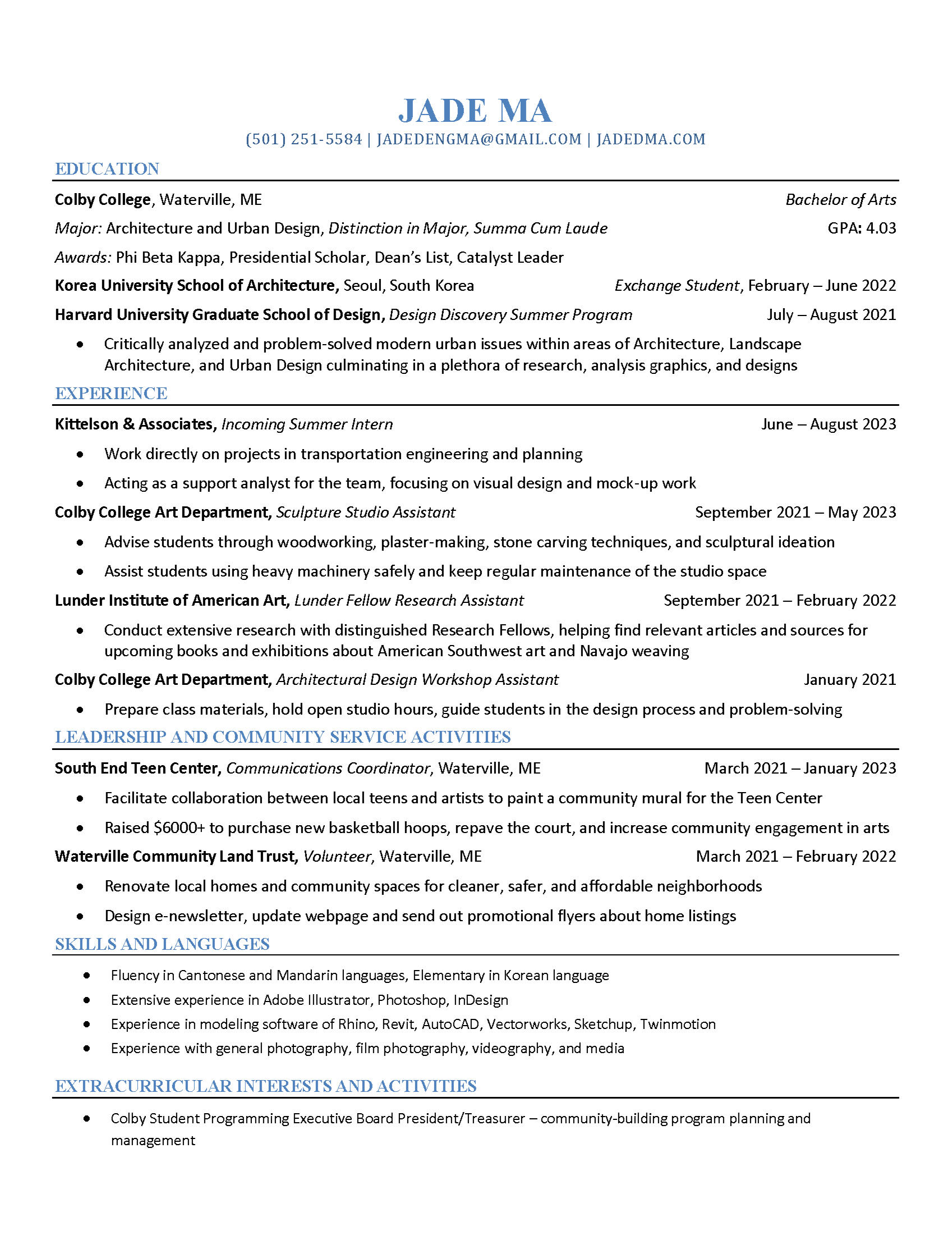 I am currently an undergraduate student at Colby College studying Architecture and Urban Design. I will be graduating in May 2023.First and foremost, I am a learner. I love to take on new challenges, adapt to new skills and environments, and think critically about our built environments and urban landscapes. I am always looking forward to my next opportunity to learn and grow as an artist and designer.