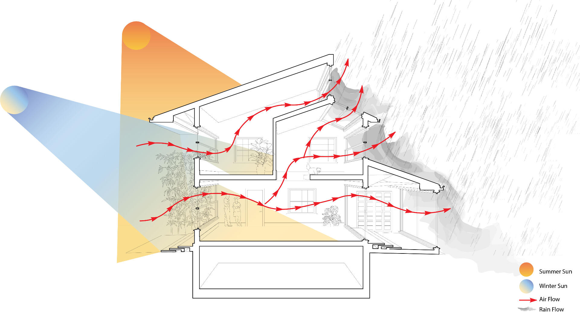 Expanded overhang seeks to minimize summer sun and optimize winter sun. Coastal storms, hurricanes, and extreme floods are major concerns as well. The terraced sloping rooftops help with directing rainfall. The raised steps help with drainage to prevent floods.