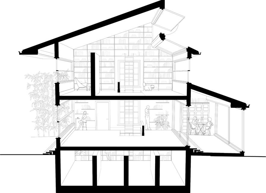 I wanted to reimagine the classic suburban neighborhood and blur the rigid lines of private and public. I wanted to open up a space for community engagement normally lacking in the suburbs. I began by thinking about liminal spaces—spaces of between.The side yard is the space between two houses. It normally has a fence as a barrier to interaction, so I wanted to take this space of separation and transform it into a connector of houses, people, and communities. I wanted to use this design and final collage presentation to challenge the long-held notions of what the suburbs can and should be.Working within the confines of the small side yard in between two single-family homes in the suburban context, I was very limited on square footage. Through creative problem-solving, I decided on a structure that physically links homes together, creating a reciprocal relationship between homes and shared space of inevitable interaction.Private room spaces become community-driven spaces like art studio on the ground story and community kitchen on the second story. Within the combined the side yard space, I have included a covered community garden/greenhouse space with a small, intimate outdoor balcony patio and a lawn space for picnics and larger gatherings.Section drawings, collages, and design program made with Rhino7, Adobe Illustrator, and Adobe Photoshop.