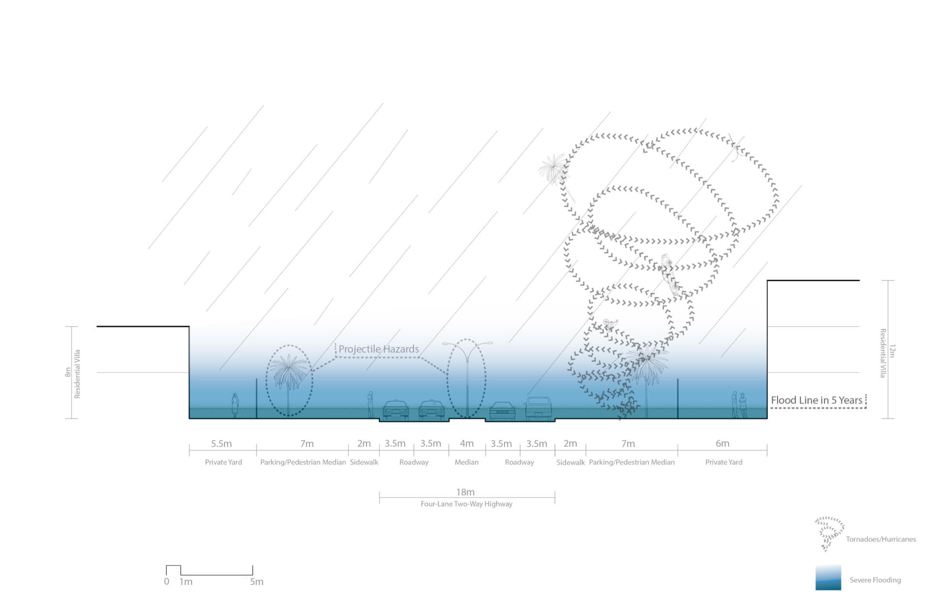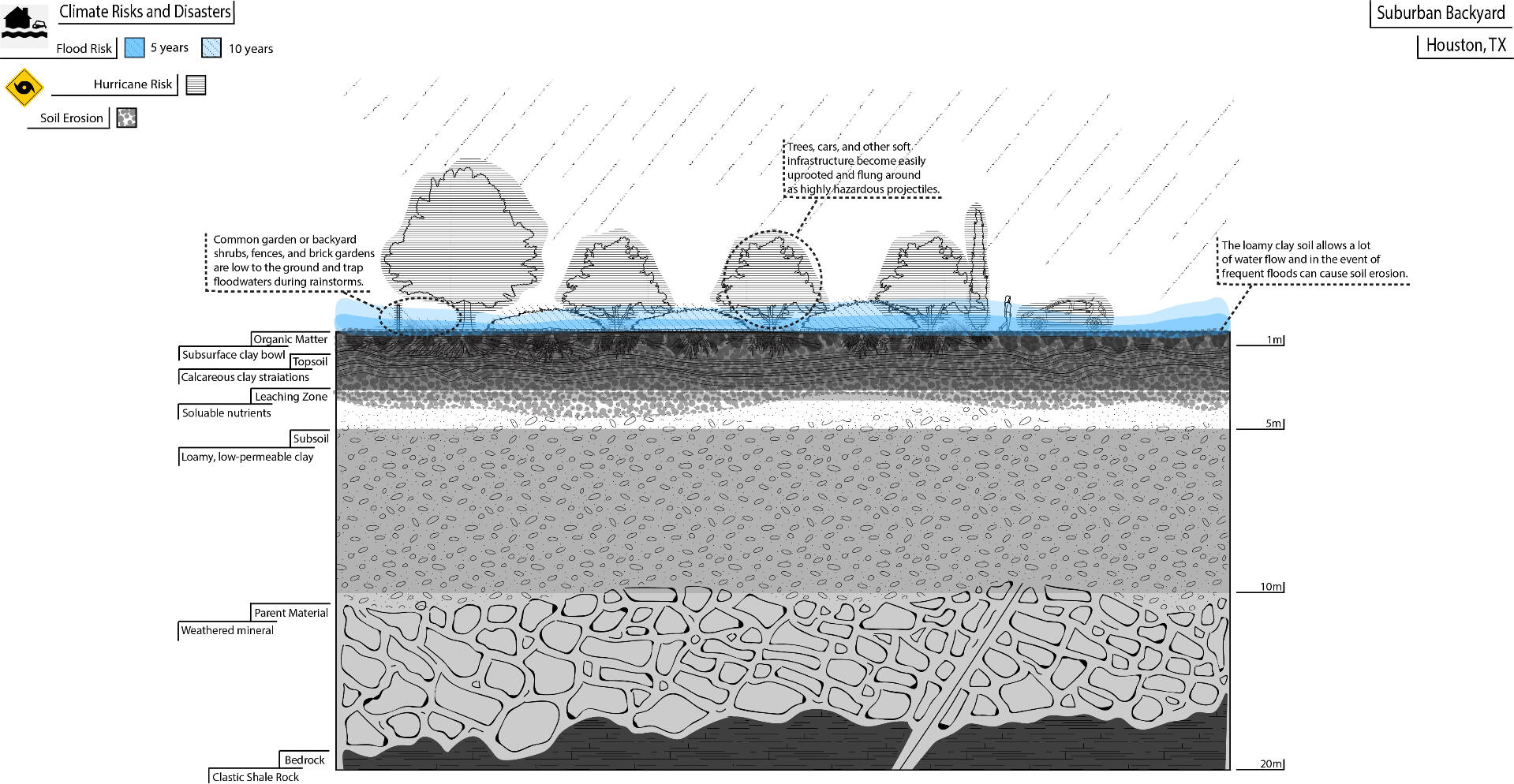Through this project, I studied the extreme weather effects of climate change on the city and suburbs of Houston, TX, critically examining our current infrastructure. Through this informational diagramming, we can establish areas of risk and find design solutions and adaptations.