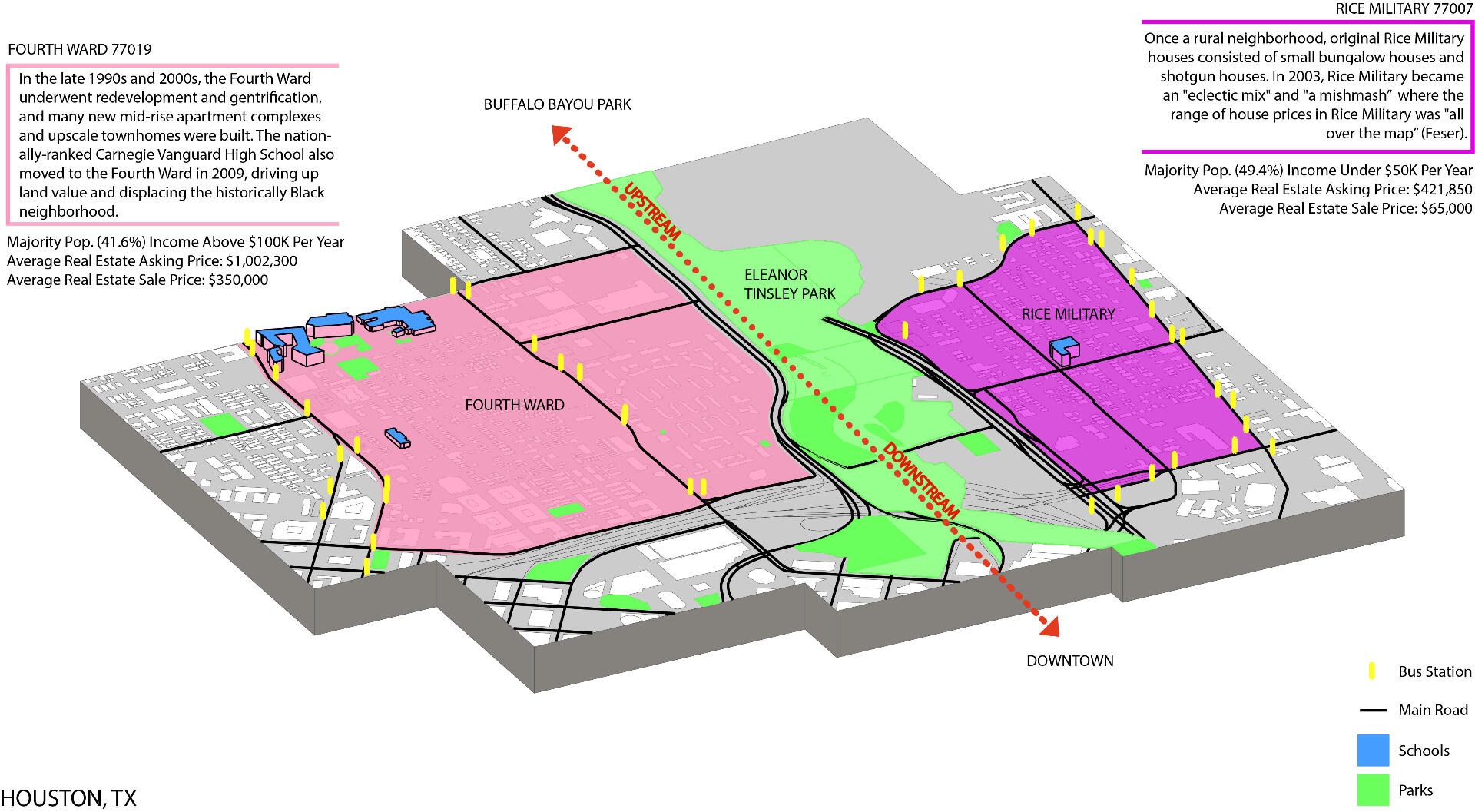 Through extensive research into the changing dynamics of downtown Houston, TX and adjacent neighborhoods, I analyzed the inequalities of infrastructure as they related to quality of life, race, and income.In this urban study, I focused on two neighboring residential areas, the Fourth Ward and Rice Military where I found a large disparity in income levels with relation to access to public transit, parks, and education. These neighborhoods are divided by a large public park and highway. I wanted to visually relate our spatial divisions and organizations to our socioeconomic divisions and examine how our built environment influences our societal relationships and hierachies, furthering inequalities.Diagram created using CADMapper, Rhino7, Adobe Illustrator, and Adobe Photoshop.