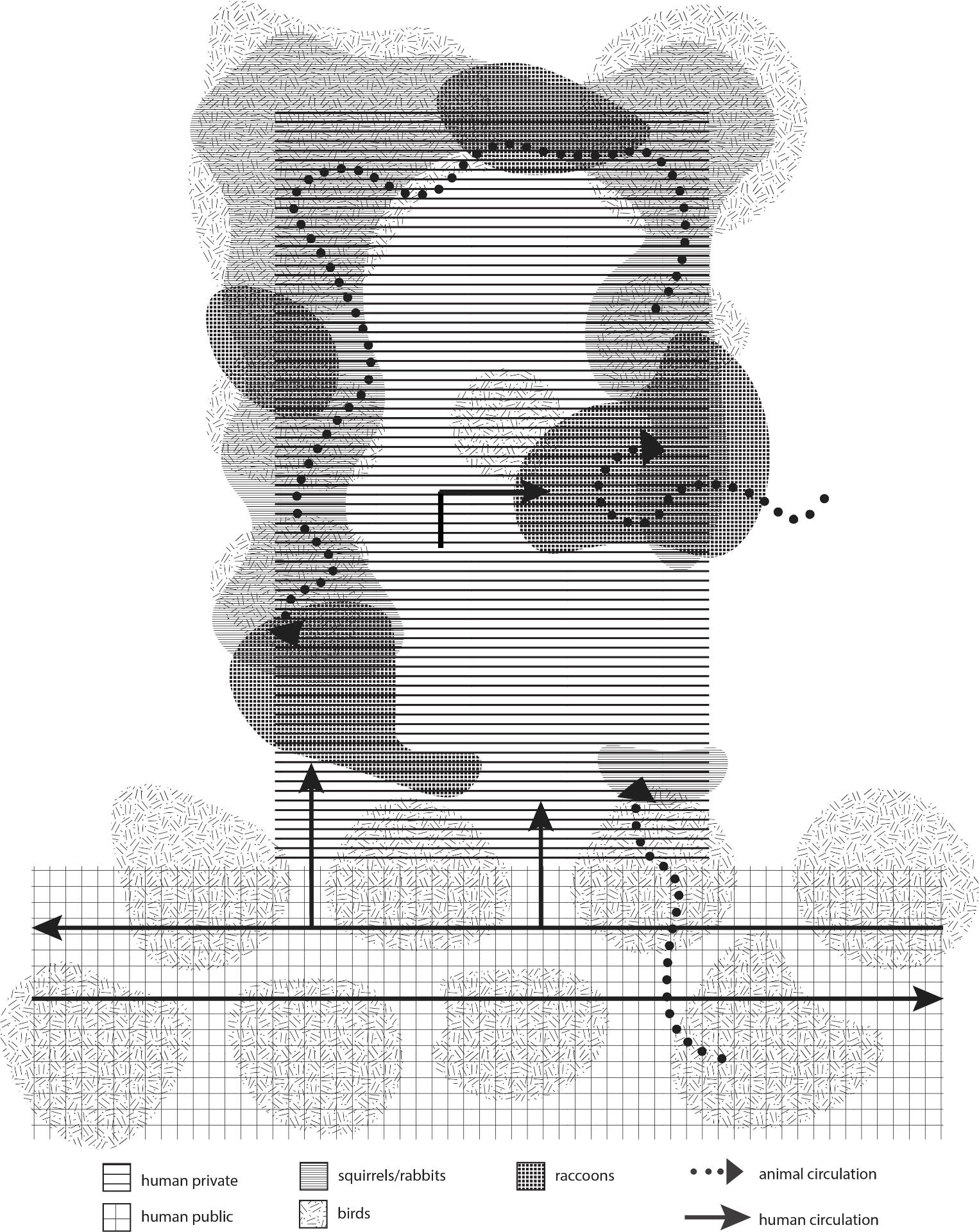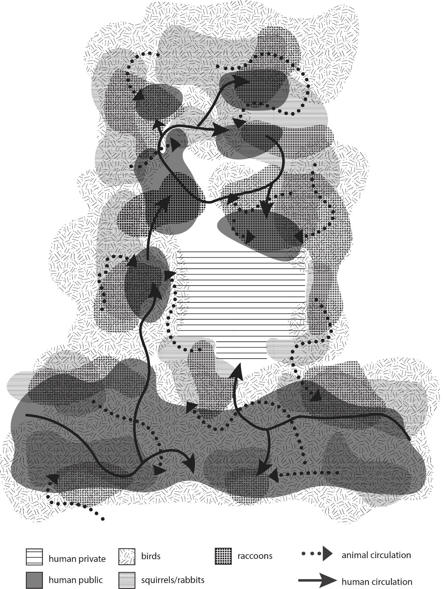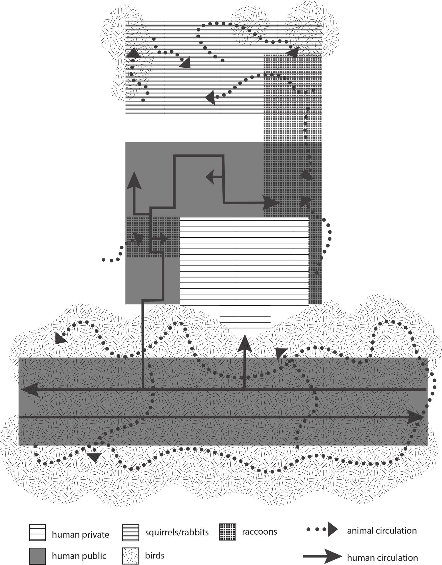 I also examined backyard spaces of suburban homes, mapping human vs. animal circulations. I then altered the landscapes to bring more areas of connection and separation between wildlife and humans within the landscape of a simple backyard context.