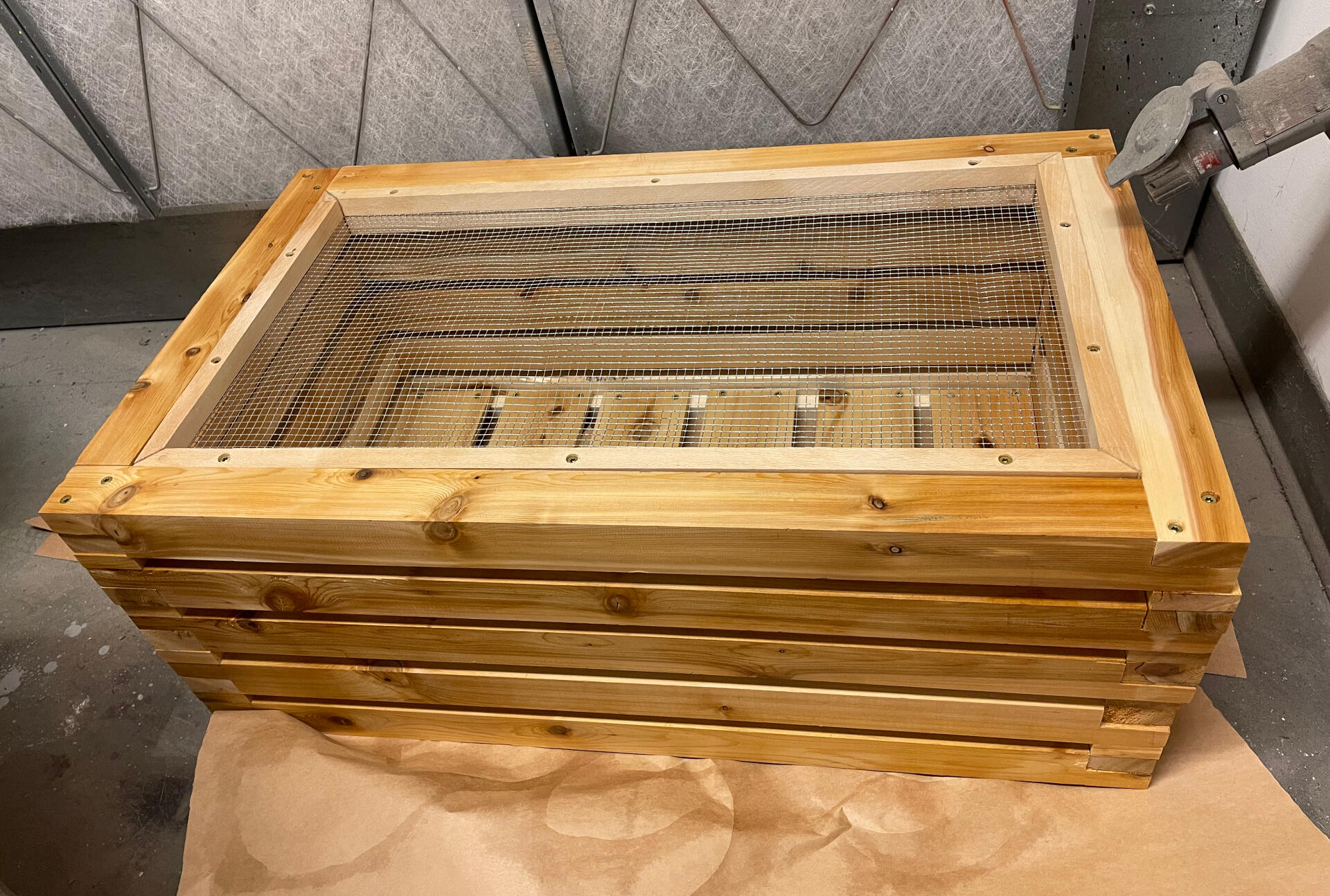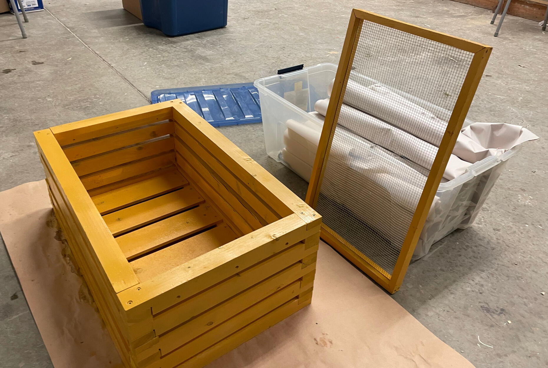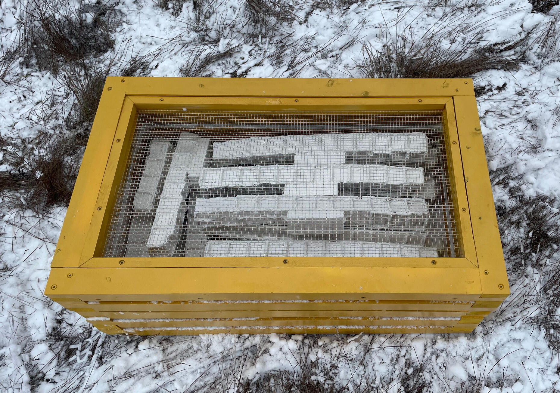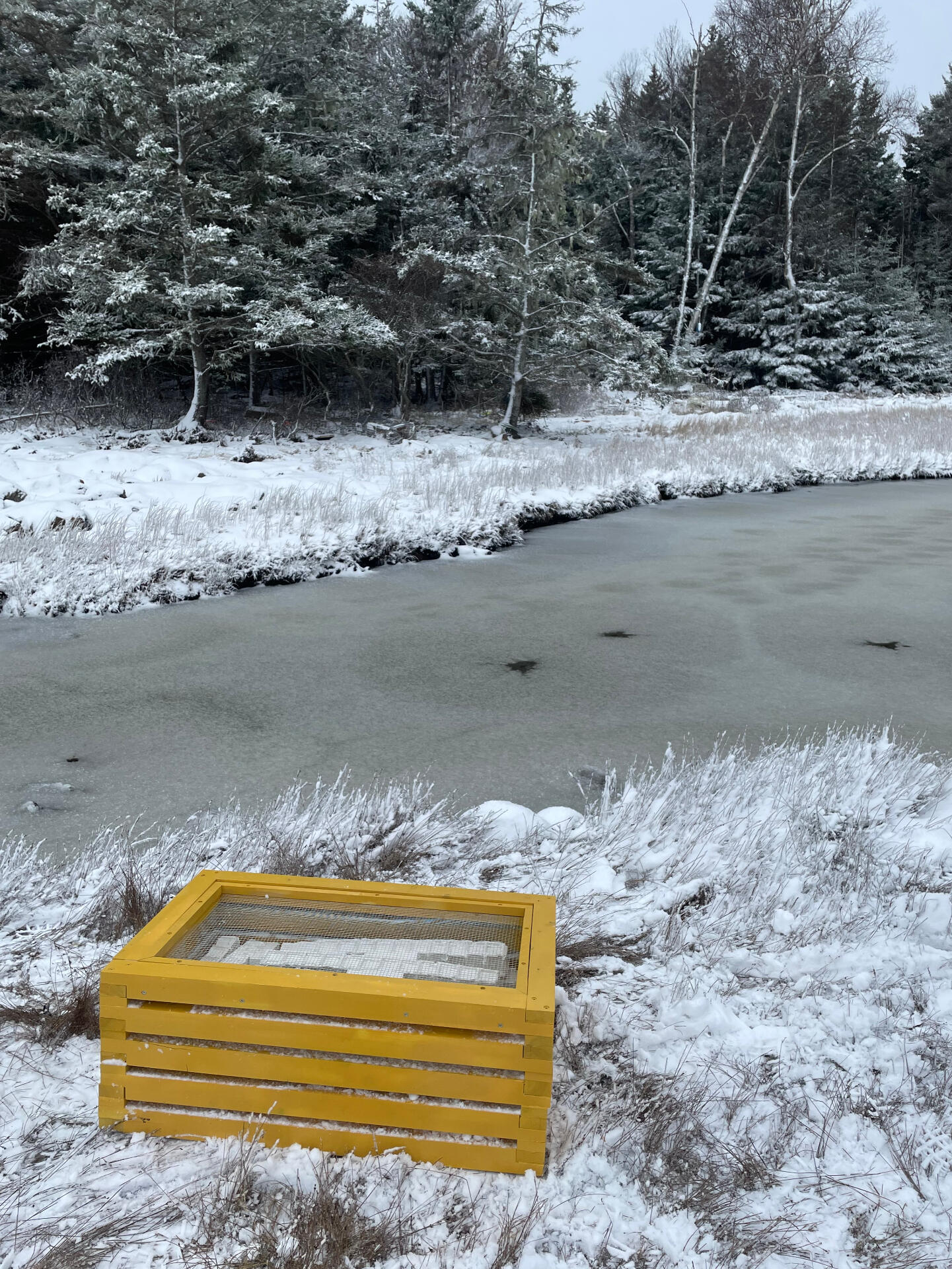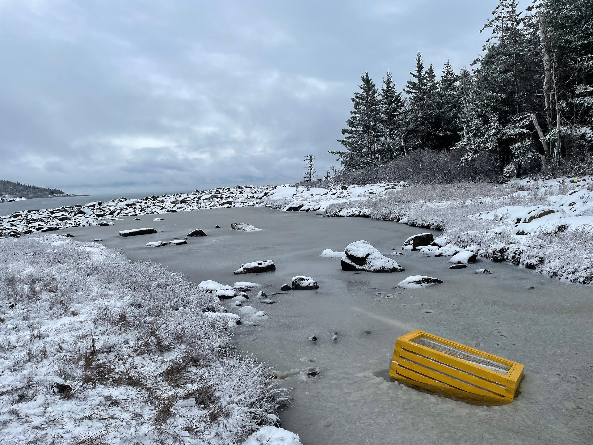 Taking inspiration from a washed-up scrap piece of a yellow lobster pot found in a shallow tidal pool of Allen Island in Maine, I created about 30 plaster copies through a mold-making process and fashioned a crate in the dimensions of a lobster pot to hold my plasters. My fabricated lobster pot is connected through lap joints with a wire frame top to allow viewers a look inside. Spray painted a luminescent yellow and reintegrated into the tidal pool on site with a natural tilt, the sculpture catches the eye and raises questions of waste and pollution among the fishing industries of Maine and man-made relationships with natural landscapes.The sculpture will be left on site from December 2021 to May 2022, reacting to the rising and lowering of the tides within the pool as a study of environmental growth and decay as well. Constructed from White Plaster, Cedar, Metal Wiring, Screws, and Spray Paint.