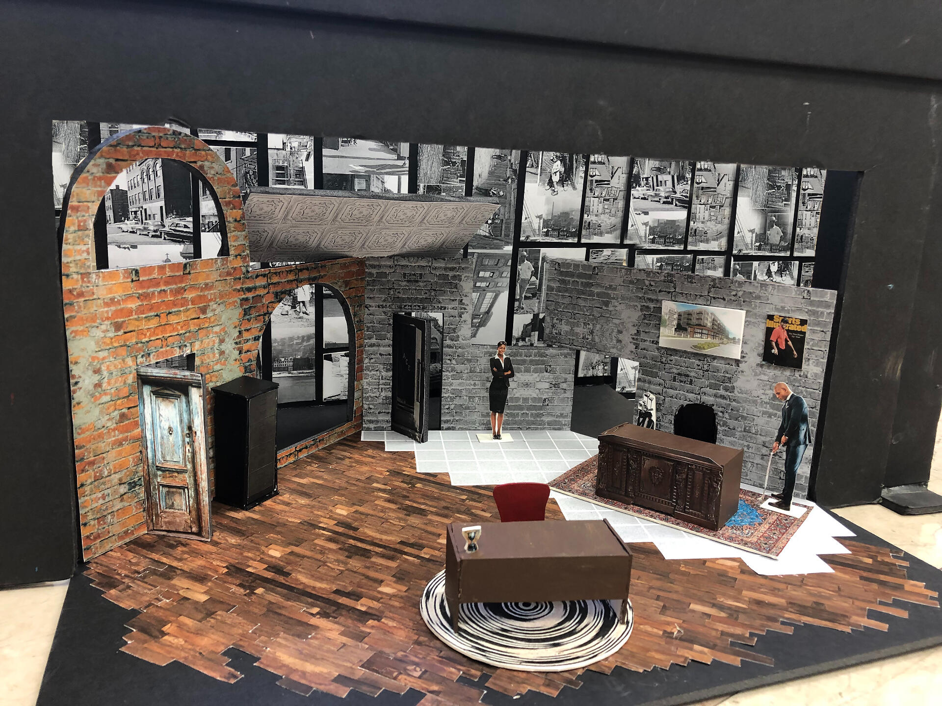 I use a backdrop of historical photos from the Hill District in 1950’s Pittsburgh as a representation of the cultural heritage that looms over the main character throughout the play and pokes through the cuts and doorways of the main set.An aerial view shows the organic patterning of wooden floorboards that suggest an extension of the office out into the audience. The encroaching black and white tile flooring begins to overwhelm the traditional wooden flooring, showing the conflicting relationship as a battleground between the protagonist and antagonist within the office.Made from Styrofoam, Paper, and Cardstock.