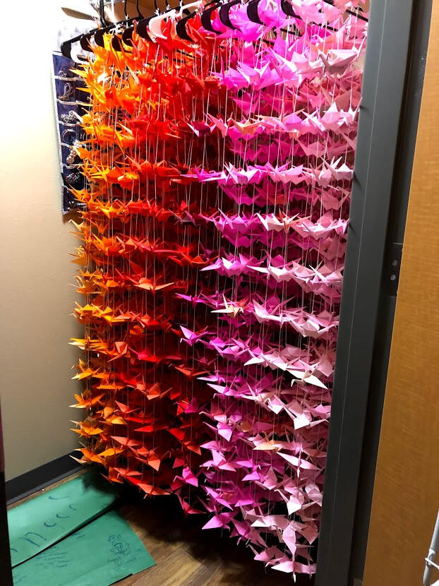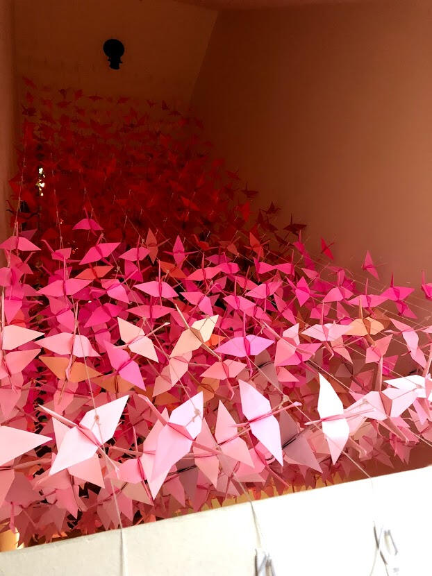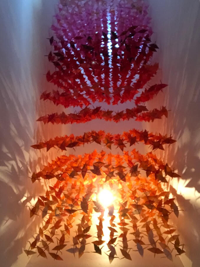 2028 meticulously crafted origami cranes in transitioning shades of red, orange, and pink. Individually folded and strung up by hand. Personal art installation commissioned for a stairwell.Created from assorted origami paper and string.