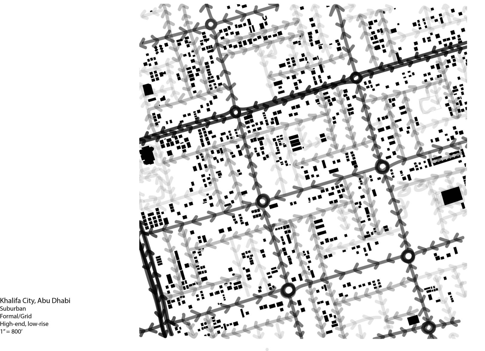 This map analyzes the highways and streets of Khalifa City. The arrows indicate direction and the gradients of the streets show accessibility and compare high traffic highways to more private neighborhood roads.