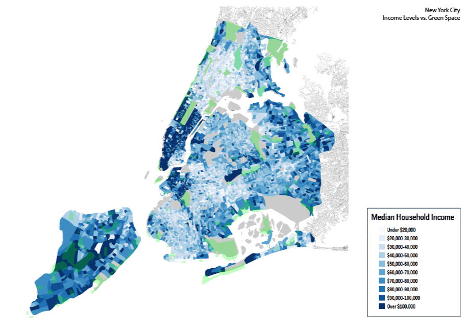 I also overlayed and analyzed the demographics of the boroughs in New York City to examine the different relationships within the city. The base map tracks median household income using census data and the overlay of green shows the relationship of high-income areas to green spaces and parks. There is a direct correlation as most neighborhoods around green spaces have significantly higher incomes.Low-income areas are densely packed and concentrated away from green spaces. The lack of greenery in low-income neighborhoods also contributes to higher temperatures and lower quality of life.This simple overlay diagram highlights relationships between socioeconomic and environmental factors of life and points out income inequalities.Diagrams created using Adobe Illustrator.