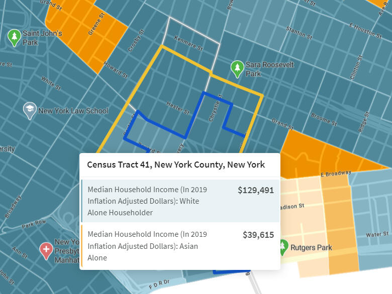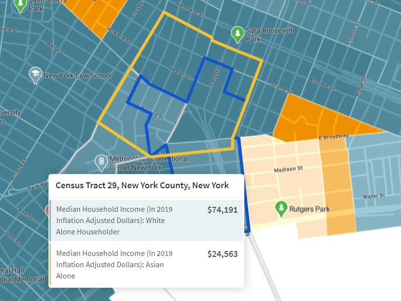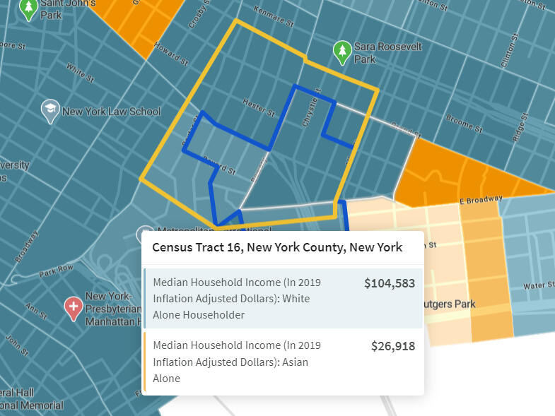 In Manhattan, one of the world’s notoriously expensive cities to live in, Chinatown and the Lower East Side have thus far been holdouts to the mass gentrification and class upcycling throughout the city — the only remaining working-class neighborhoods in Manhattan south of Central Park. In the face of recent high-rise luxury tower development, there have been protests by long-time aging residents of Chinatown which have “highlighted the fears and struggles of a working-class Asian-American community often ignored in the larger narrative of model minorities.”Comparing median income levels of census blocks with 90% or above populations of Asians, Asian incomes fall far into poverty, while White resident incomes almost double or triple that of Asian counterparts in Chinatown. Aside from median income changes, Chinatown is also facing a threat to the ethnic enclave with recent trends showing shifting racial demographics since 2013; the Asian population is steadily declining while the fastest-growing demographic has been the White population.The yellow borders mark approximate residential boundaries of Chinatown and the blue borders mark approximate commercial boundaries. The census tracts are outlined in a white highlight and are the areas that most overlap with Chinatown.Maps created on Social Explorer.
