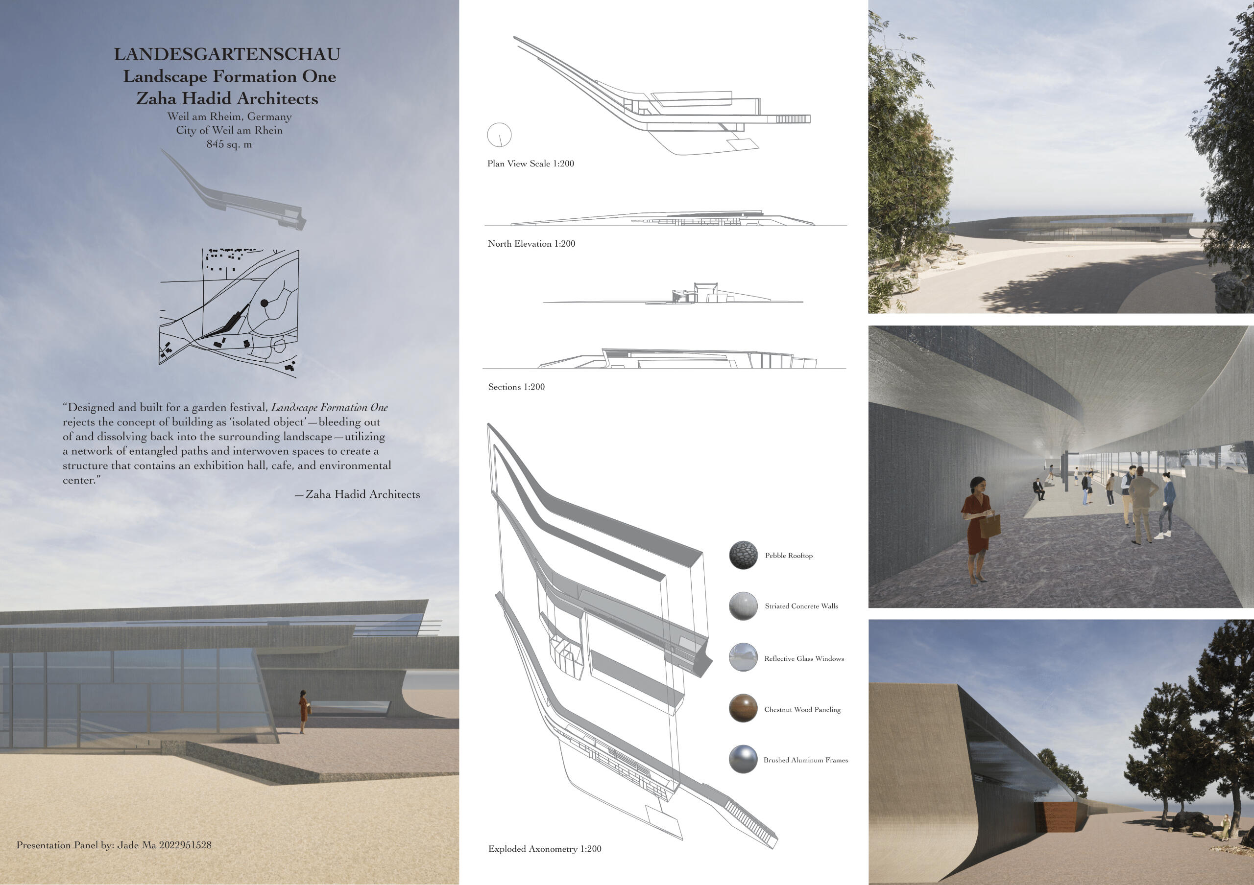 Below are my models of Zaha Hadid's Landscape Formation One shows in axonometric view and as an overall design presentation board with scale views and renders. Modeled using Rhino7, designed with Adobe Illustrator, and rendered using Twinmotion.