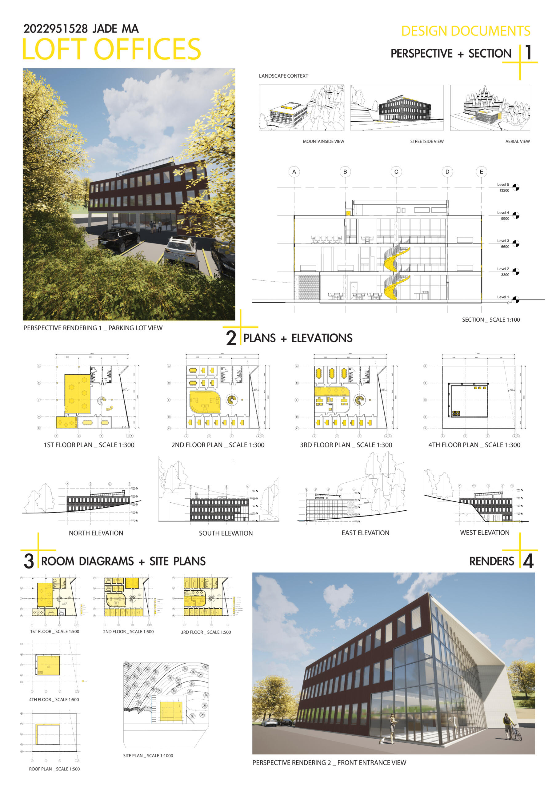 Below is my presentation board for a multi-story office building designed in AutoCAD. The poster was designed with Adobe Illustrator and perspective renderings were made using Twinmotion.