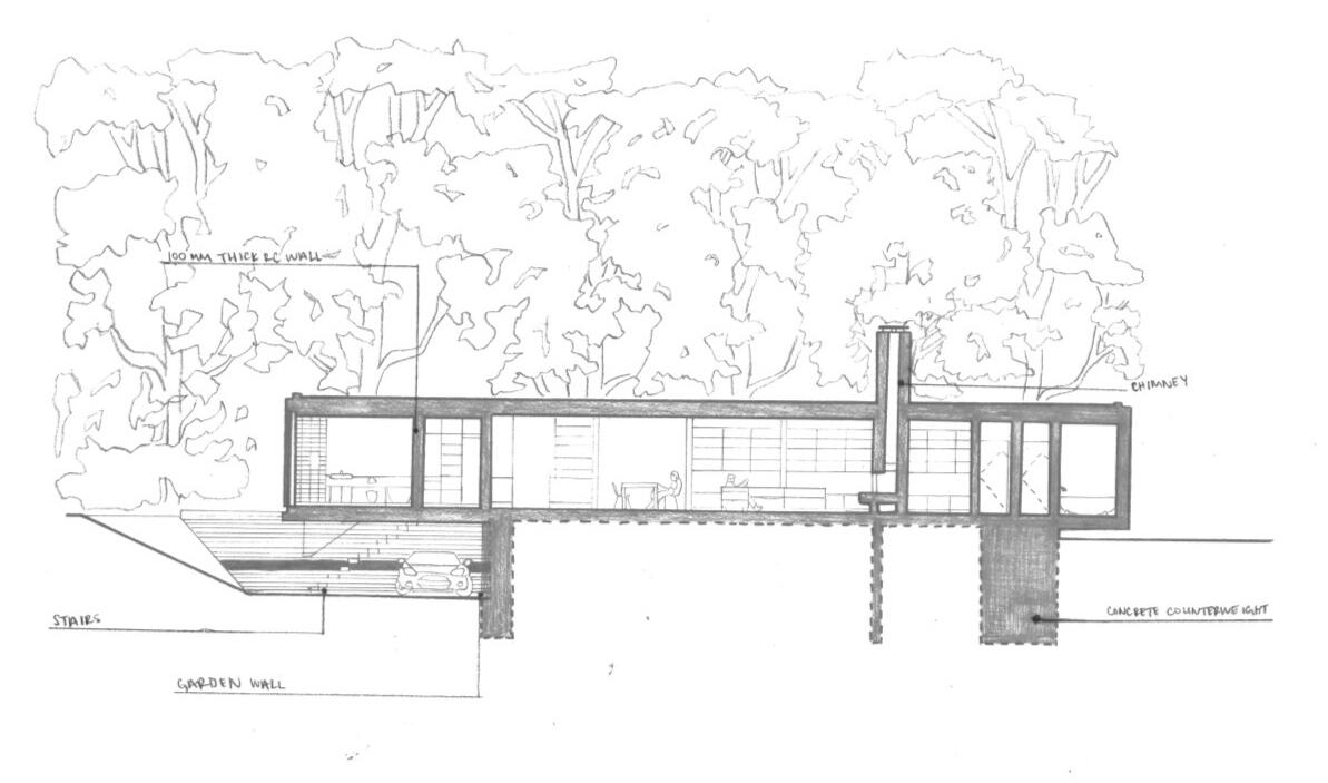 Section of suggested site for the structure, showing interactions between the original and proposed lakebed and rocky cliffside.