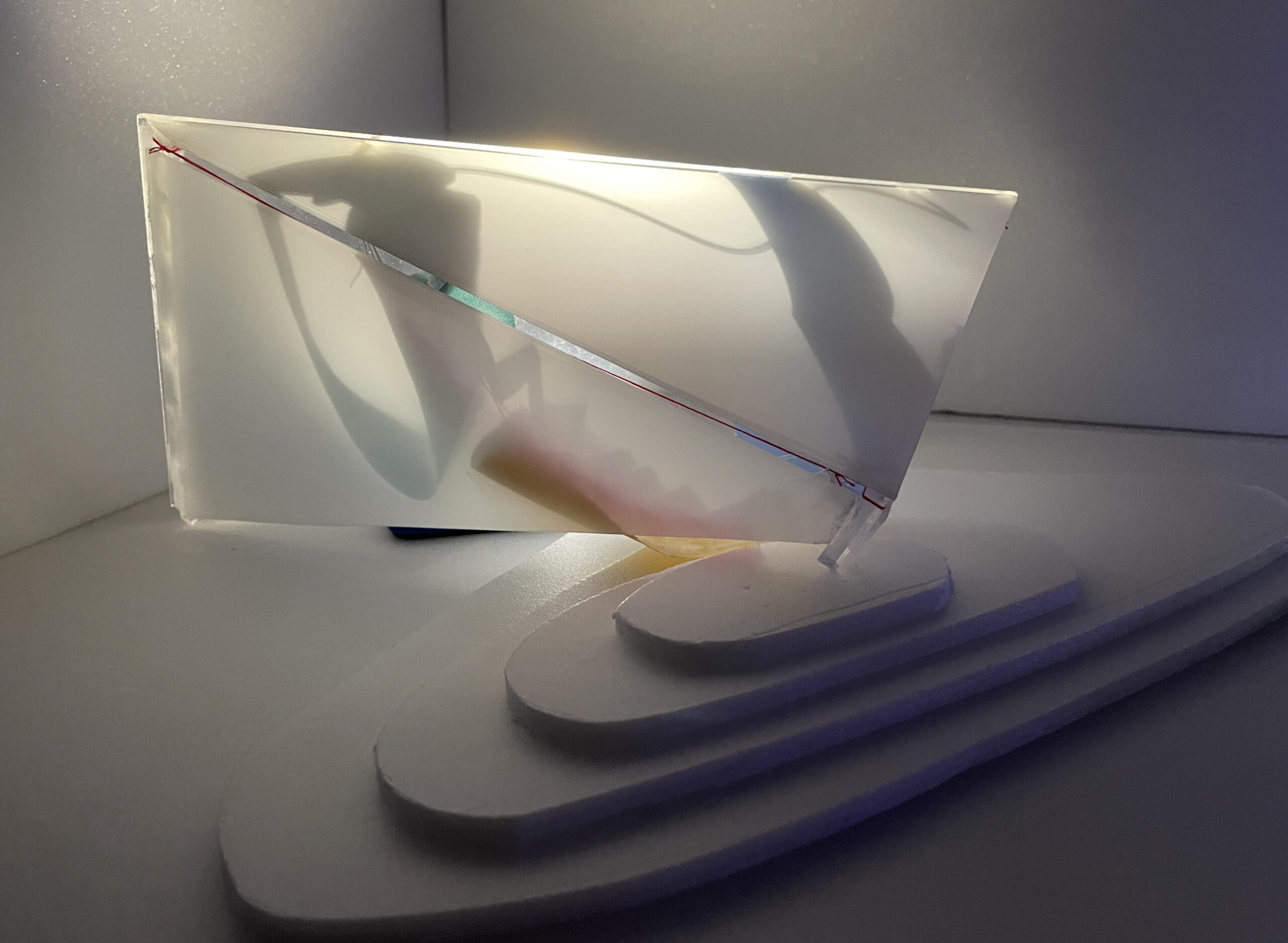 Building off the abstract fun of “PLAYFUL,” the pavilion below seeks to bring two opposite emotions together in one structure: PLAYFUL and SERIOUS. This pavilion contrasts exterior/interior and day/night to bring continually different experiences for users. The cold-cut and translucent white exterior is straightforward and earnest during the light of the day, but at night, the light inside the structure reveals a hidden trove of color and shape through whimsical shadows cast on the blank canvas of the walls. This pavilion seeks to intrigue and entice, bringing fun to a serious space of study on campus.