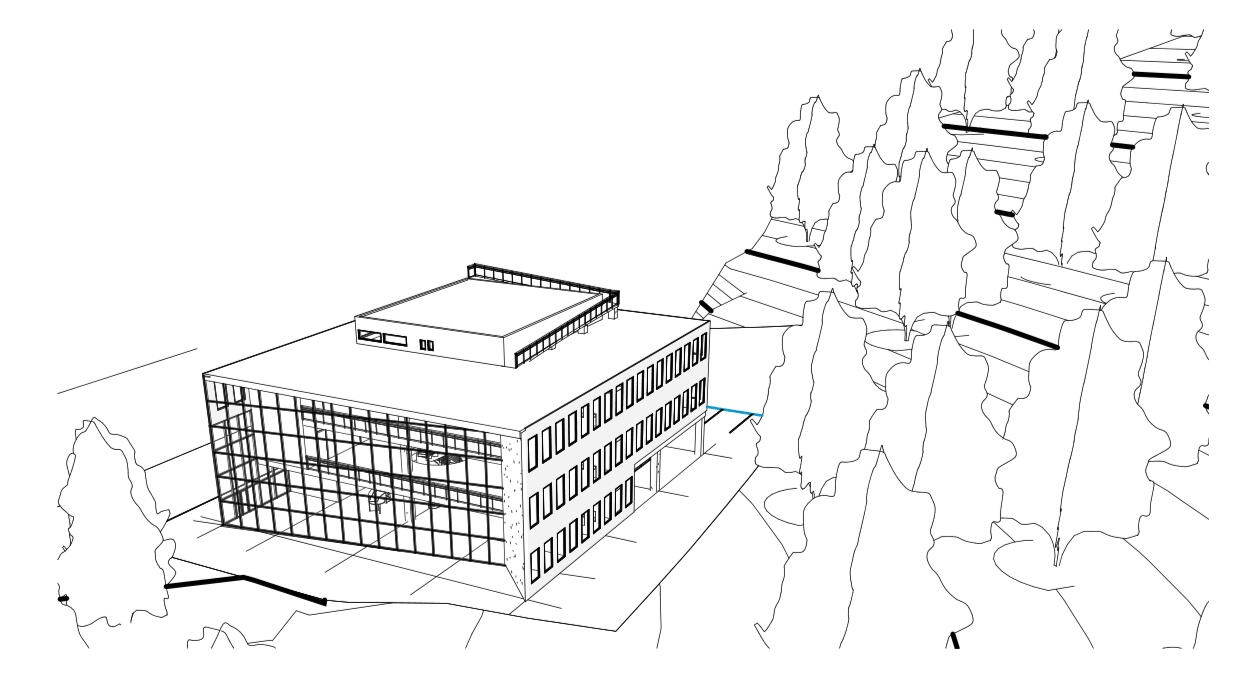 Through onsite investigations and the modeling of topographic landscape, I captured the nuances of the hilly forest, contrasting with the frozen frigidity of the lake as the shore meets the land. Different textures and thicknesses of lines give lively qualities to the drawings and help contextualize the proposed structure. Ink gives life to the landscape.